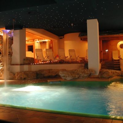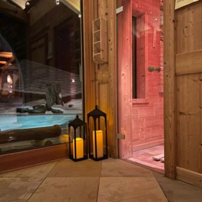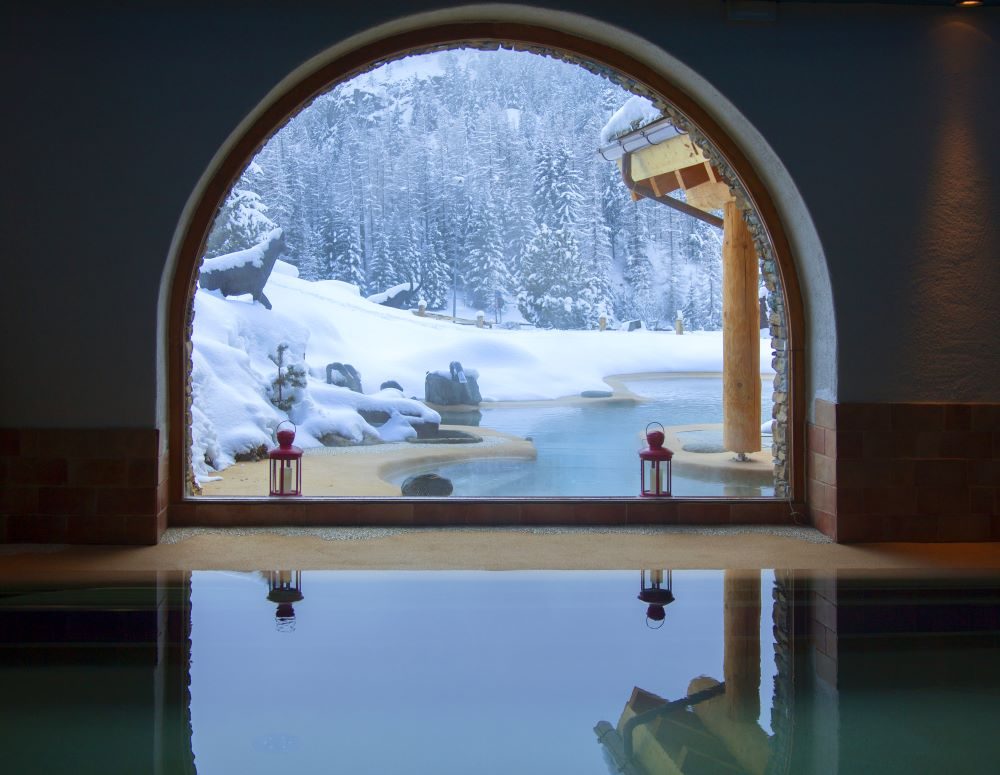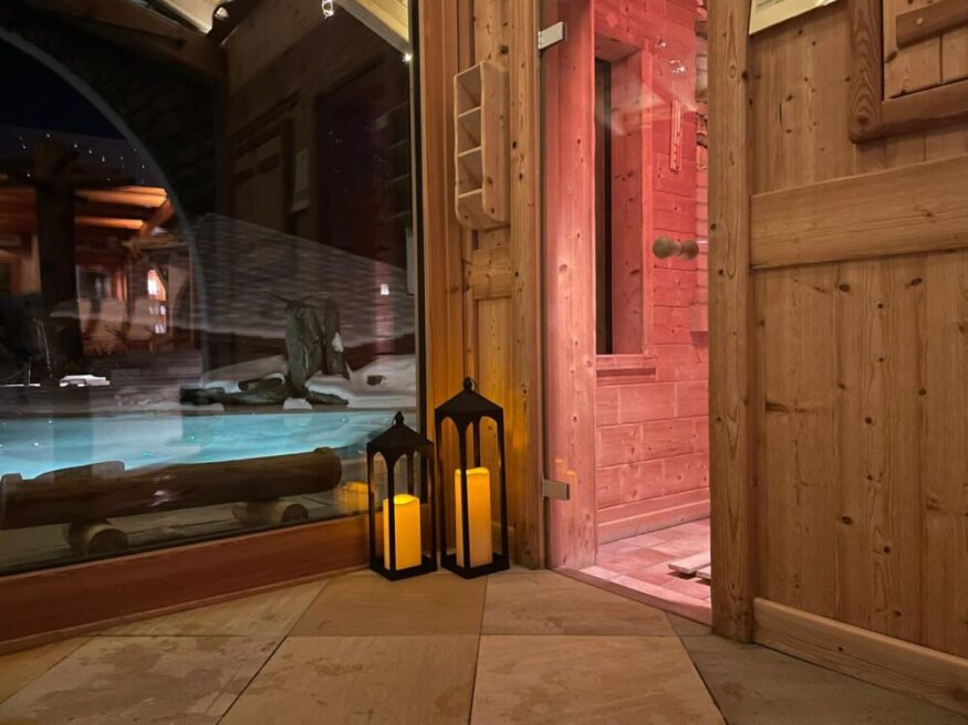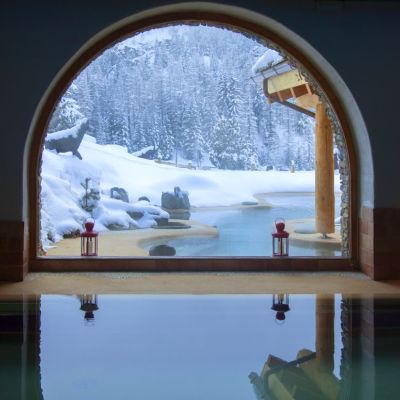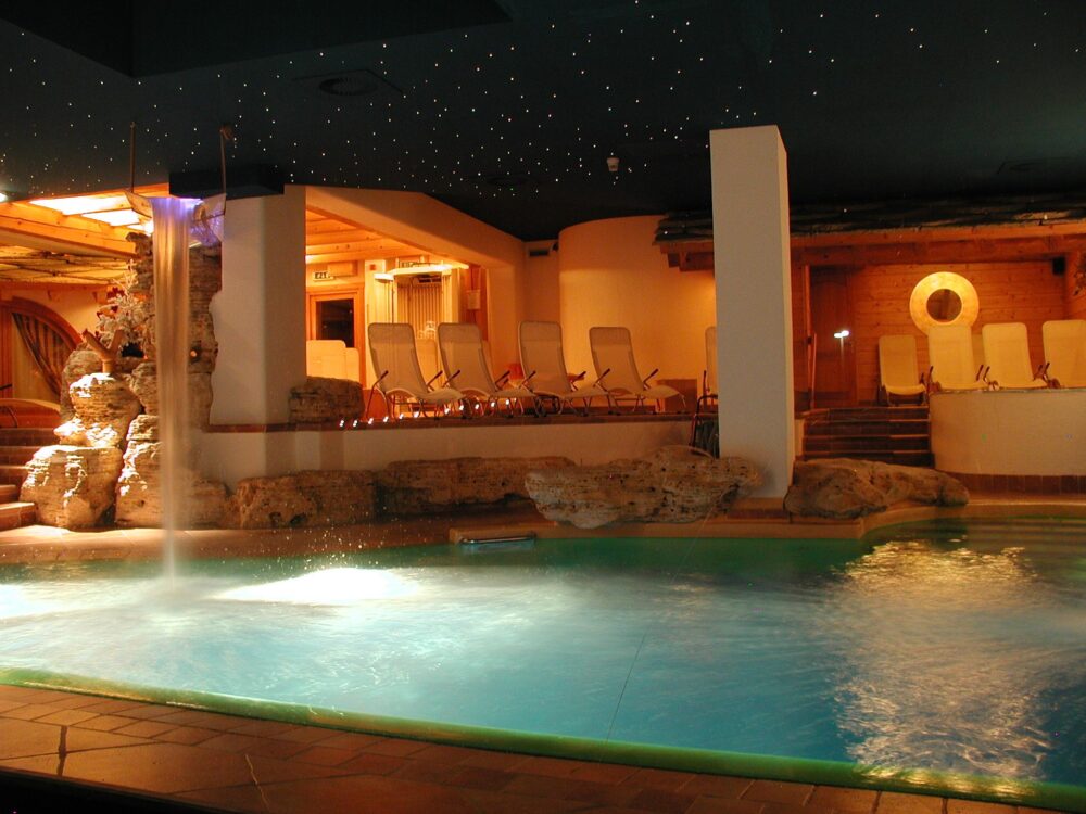 • Ingresso al centro benessere con il suo laghetto alpino esterno riscaldato da fonti rinnovabili